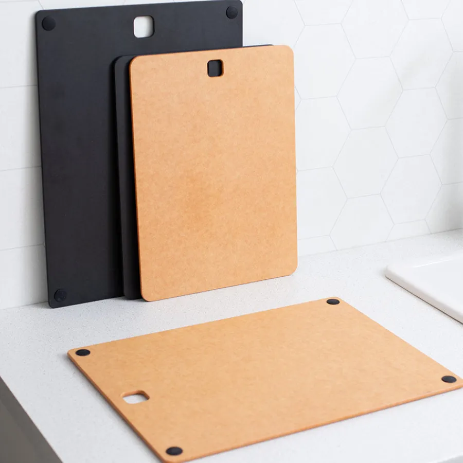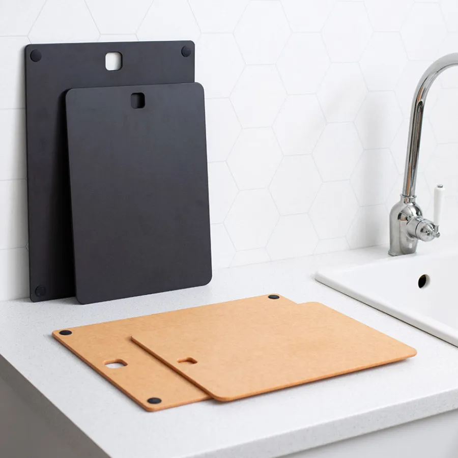 Skjærebrett i resirkulert papir fra serien med kjøkkenredskaper, Kitchenline. Det slitesterke materialet gir en pålitelig overflate for matlaging som ikke absorberer fukt og det reduserer miljøavtrykket. Skjærebrettet tåler opptil 176℃ og kan dermed også brukes som bordskåner.