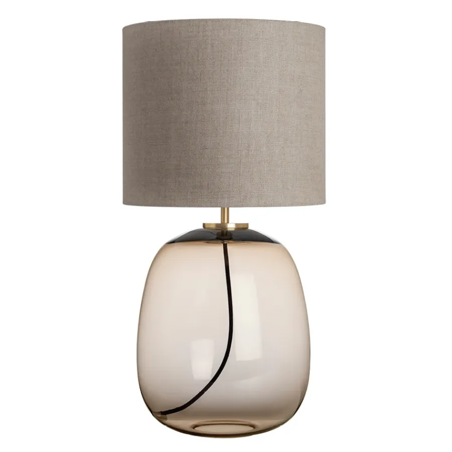 Austra Bordlampe Kakao bringer varme og naturlig eleganse inn i hjemmet. Den munnblåste glassfoten i en dyp, jordnær kakaonyanse gir en lun kontrast til den lyse tekstilskjermen. Lyset filtreres behagelig gjennom skjermen og gir en rolig atmosfære, perfekt for stuen, soverommet eller en lesekrok.