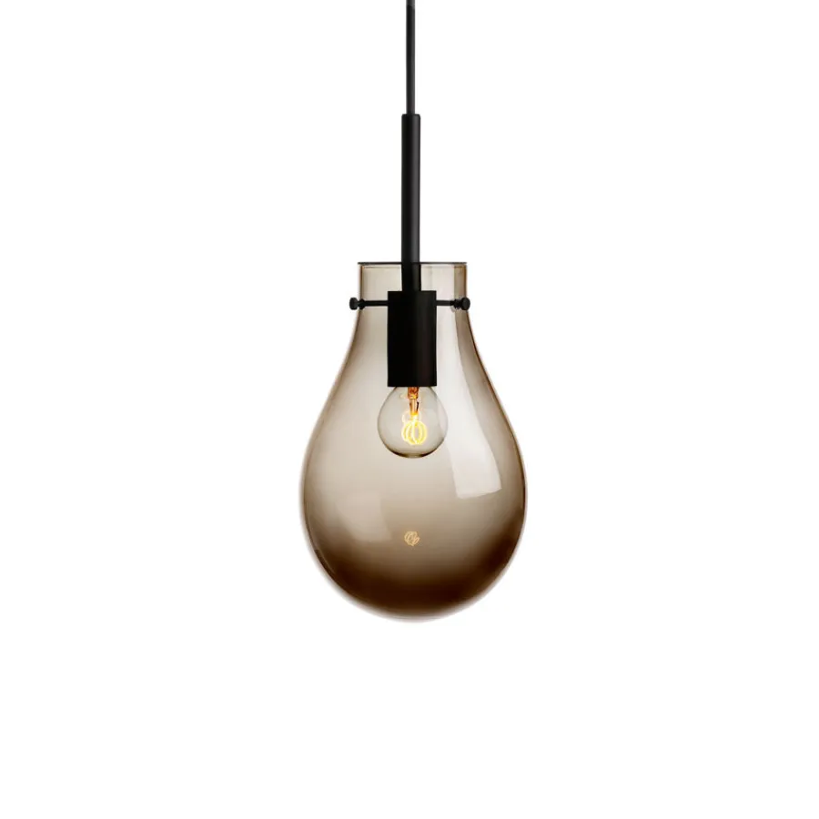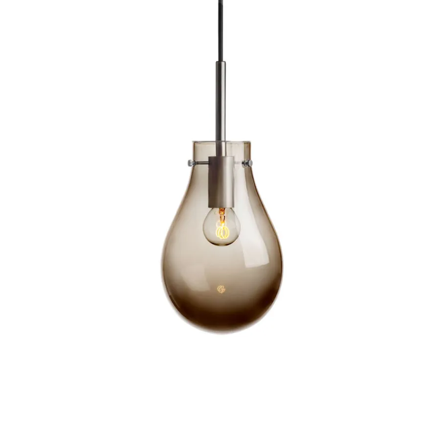 Dråpe Kakao Glatt kombinerer enkelhet og varme i et tidløst design. Den munnblåste glasskuppelen, i en dyp og rik kakaofarge, gir et mykt og behagelig lys som skaper en lun atmosfære i rommet. Den glatte overflaten fremhever glassets naturlige glans og gir lampen et rent, elegant uttrykk.