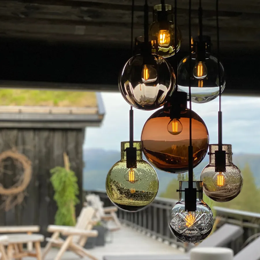 Hver krystallkule er munnblåst og håndslipt etter 250 år gamle tradisjoner på Hadeland Glassverk. Variasjonene i form og farge gjør at hver lampeoppsats blir unik, og de diamantslipte mønstrene tilfører ekstra dybde og karakter til glasset. Komposisjonen består av: glatt kakao 200 mm, optikk kakao 160 mm, glatt røkgrå 160 mm, soda oliven 160 mm, optikk oliven 120 mm, soda kakao 120 mm og Finn røkgrå 120 mm.