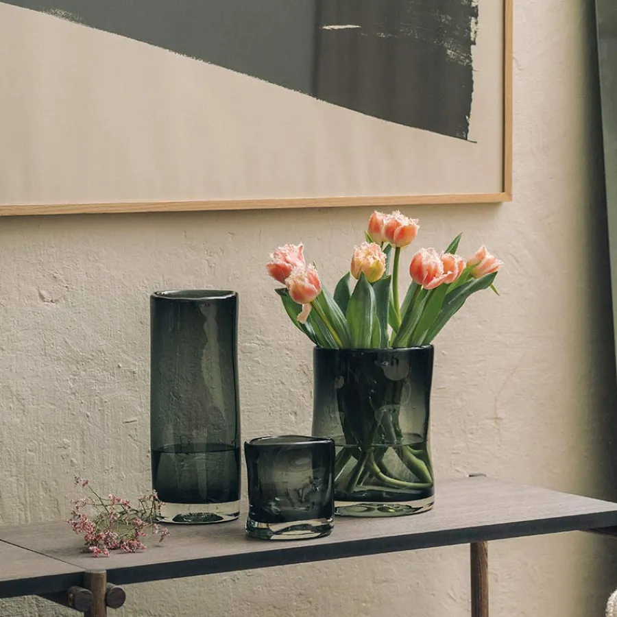 Munnblåst telysholder i røkgrå fra Hadeland Glassverk og serien Sine. Den flotte lyslykten kommer i en røkgrå tone som sammen med de organiske formene skaper et stilfullt og delikat preg til stuen og bordet. Serien er designet av Maud Gjeruldsen Bugge og byr i tillegg til den lille lyslykten på to flotte vaser som kan kombineres for et dekorativt uttrykk. Telysholderen måler 12,5 cm x 10,5 cm og er også flott som en liten vase fylt med en liten bukett av friske blomster. Hvert stykke fra serien håndslipes og munnblåses, som gjør hvert produkt unikt.