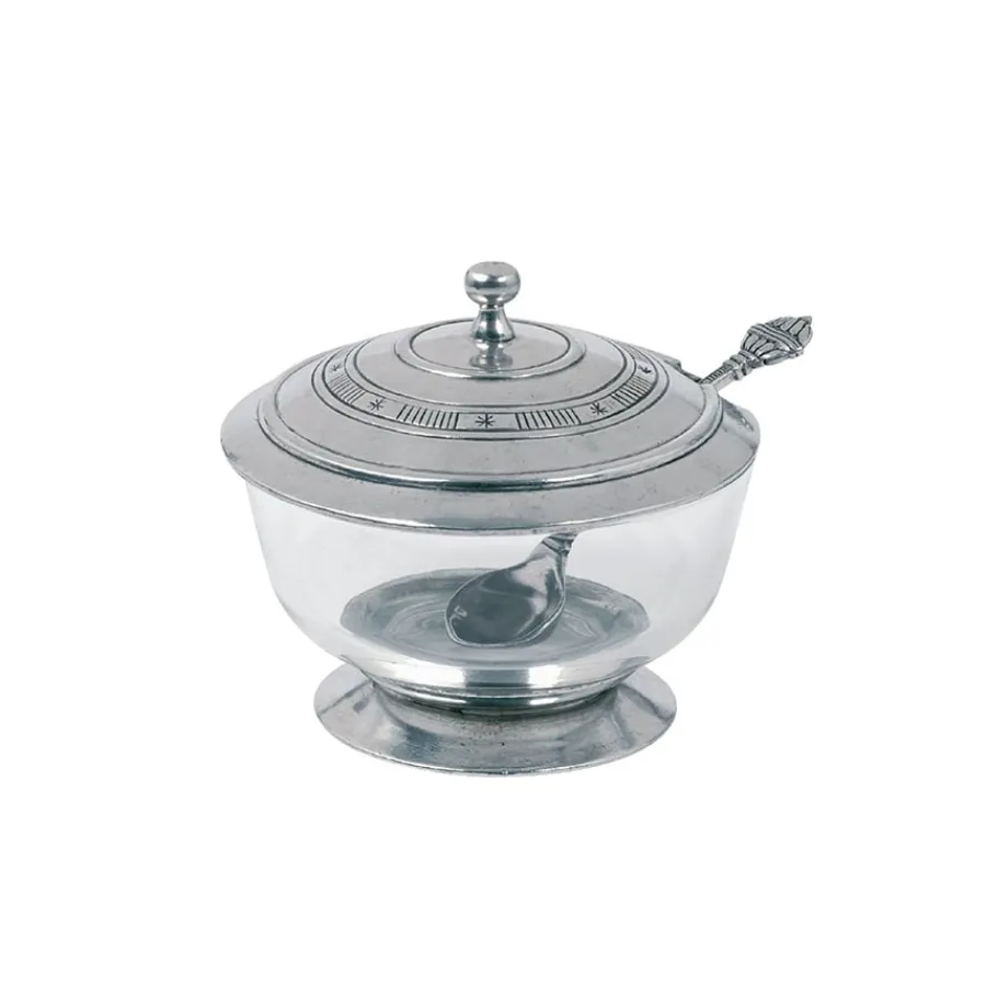 Skål i glass med lokk og skje i tinn fra Hadeland Tinn. Skålen er perfekt til syltetøy eller sukker.