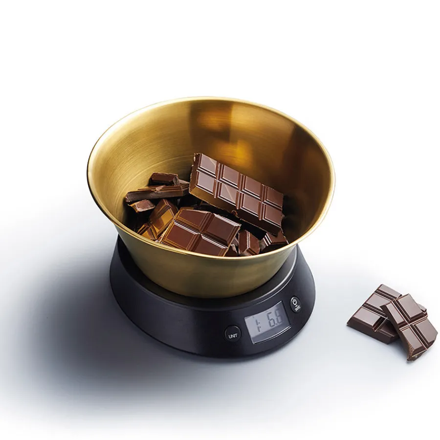 Kjøkkenvekt i sort med bolle i fargen gull fra Masterclass. Den praktiske kjøkkenvekten kan veie opptil 5 kg, og er utformet med en LCD-skjerm som er enkel å bruke.