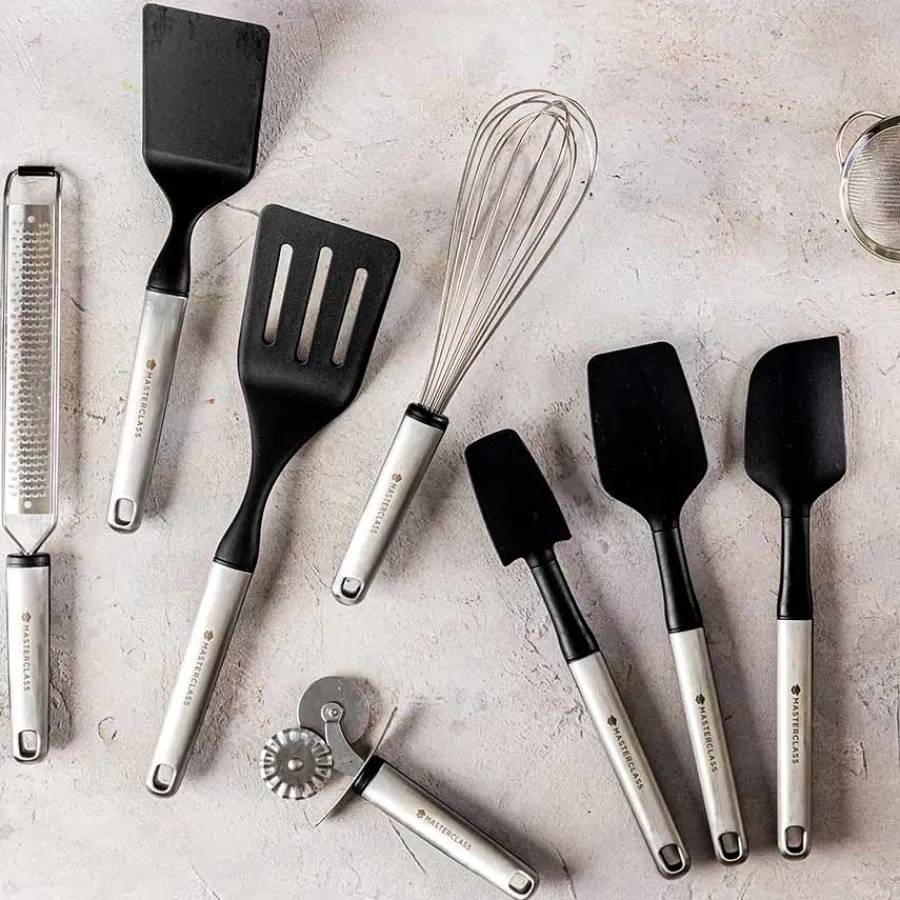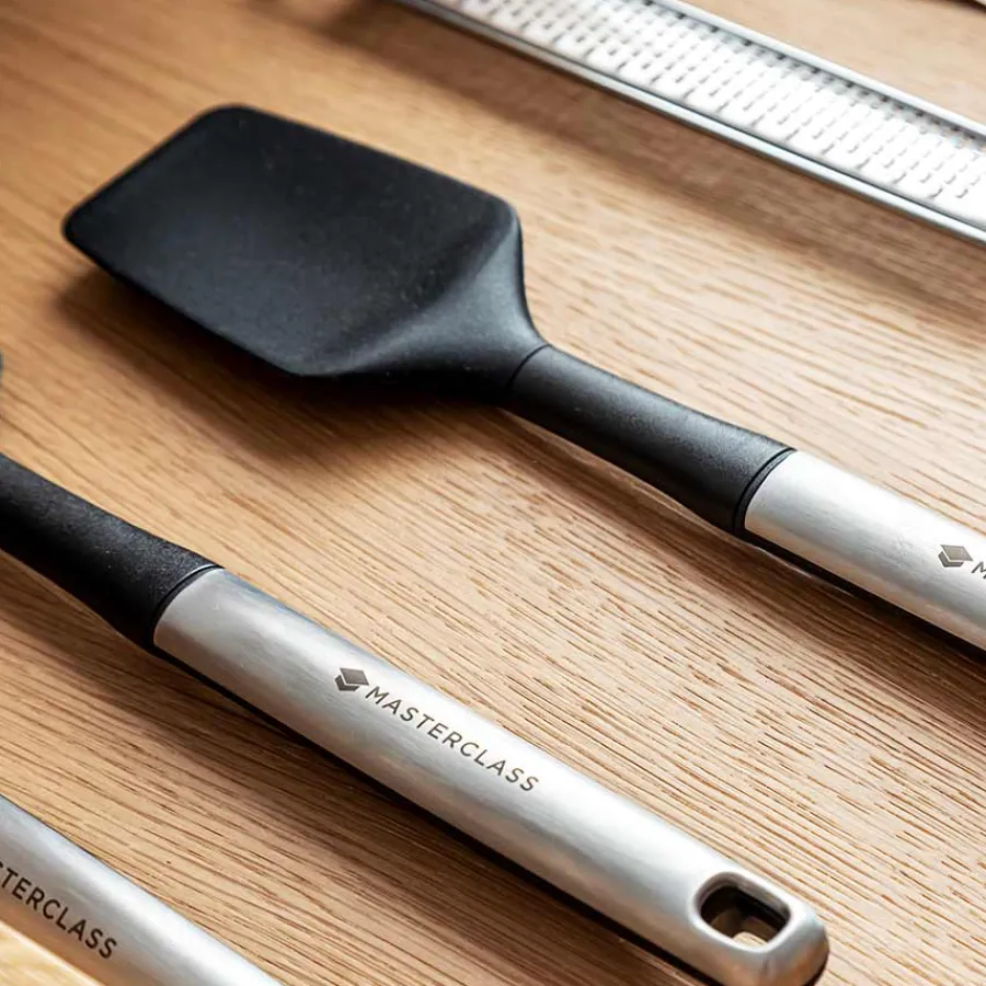 Røreskje på 30 cm i rustfritt stål fra Masterclass. Røreskjeen har et mykt ergonomisk håndtak, designet for å minimere spenninger i musklene og utformet for å gi et ekstra grep. Røreskjeen har en myk tupp og er praktisk til bruk i en airfryer. Røreskjeen tåler opp til 232 grader og kan rengjøres i oppvaskmaskin.