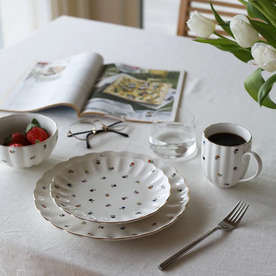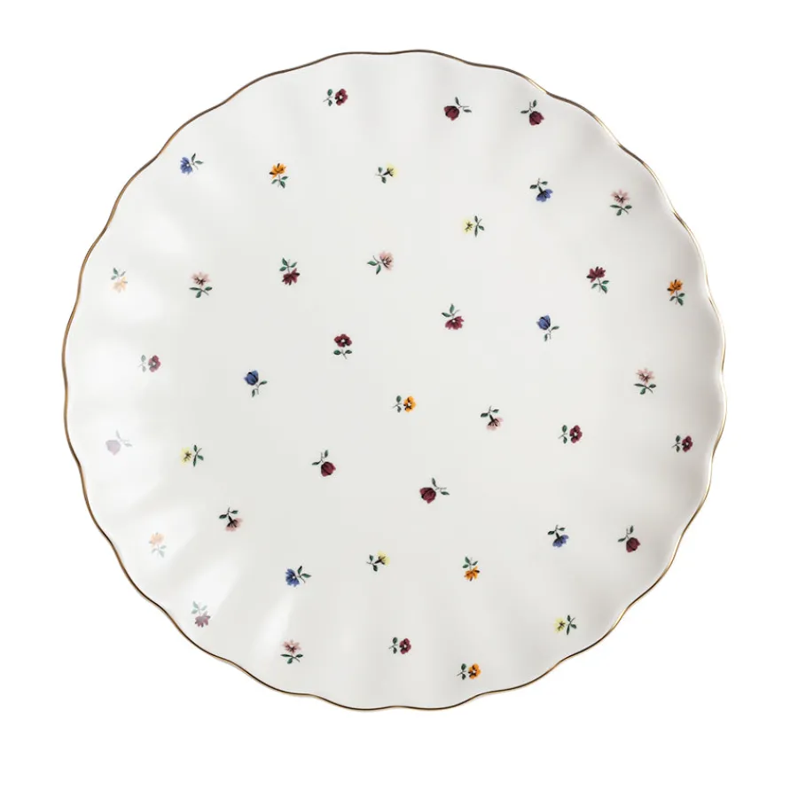 Skap et romantisk uttrykk på bordet med Nova Lilly tallerken 26 cm. Den klassiske, hvite flaten er dekorert med små, fargerike blomster og innrammet av en delikat gullkant. Den bølgede formen gir et nostalgisk preg, samtidig som det elegante uttrykket gjør tallerkenen velegnet til både hverdag og selskap.Tallerkenen passer perfekt som middagstallerken og kan enkelt matches med andre deler fra Lilly-serien – tilgjengelig i flere farger for deg som ønsker et personlig uttrykk.Vi anbefaler skånsom håndvask for å bevare gullkantens glans. Tåler ikke mikrobølgeovn.