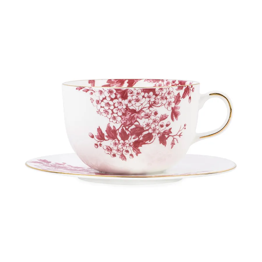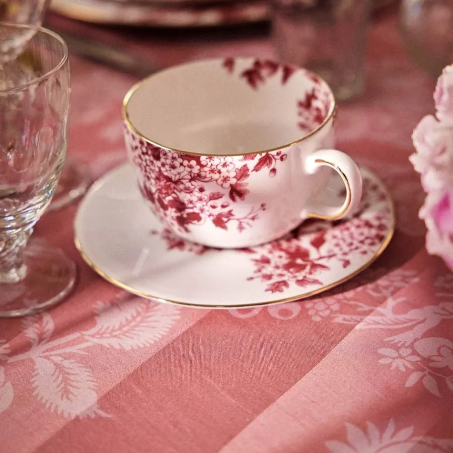 En kopp og skål på 40 cl i dyp burgunder som gir rom for store varme drikker. Gullkanten tilfører eleganse, perfekt for alt fra kaffe til kakao.