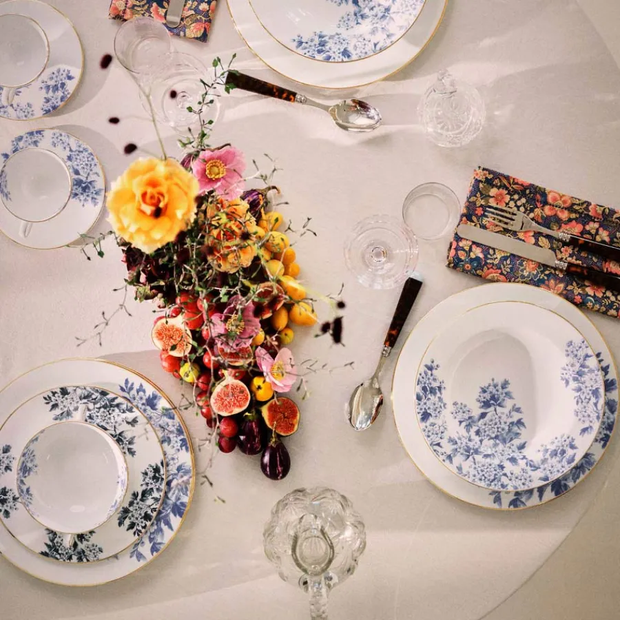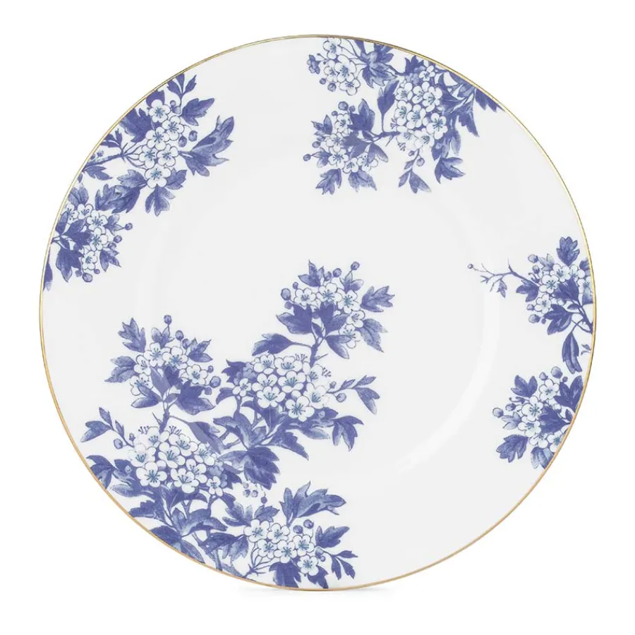 Designet av ByTimo, denne mellomstore tallerkenen med blå blomsterdetaljer gir et tidløst og sofistikert preg på borddekkingen. Den er laget i benporselen som både er delikat og slitesterkt, og passer utmerket til både hverdagsmåltider og fest. Håndmalte gulldetaljer gjør den ekstra eksklusiv.