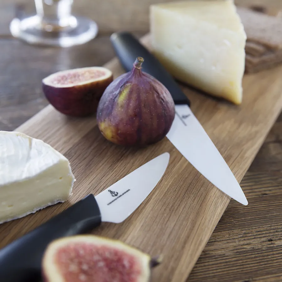 Grønnsakskniv på 13 cm fra Porsgrunds Porselænsfabrik og knivserien De Cuisson. Kniven er fremstilt i porselen, som sikrer et skarpt blad egnet for kutting av myke grønnsaker og frukt. Materialet gir også en lengre holdbarhet til frukt og grønt, da oksideringsprosessen settes raskere i gang ved bruk av kniver i stål. Håndvask anbefales. Bruk aldri kniven på harde grønnsaker som søtpotet eller kålrot. Les mer om bruk under tilleggsinformasjon.
