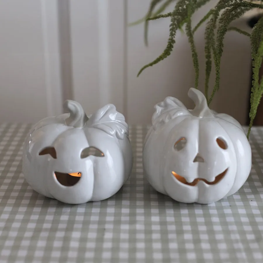 Skap en stemningsfull atmosfære med gresskar lyslykt i keramikk, 15 x 14,5 cm, fra Porsgrunds Porselænsfabrik. Med sitt myke formspråk og koselige uttrykk sprer den varme og hygge i hjemmet, enten du bruker den på mørke høstkvelder eller som en helårsdekorasjon.