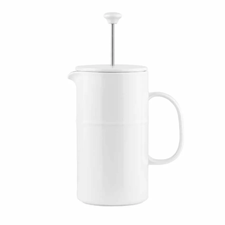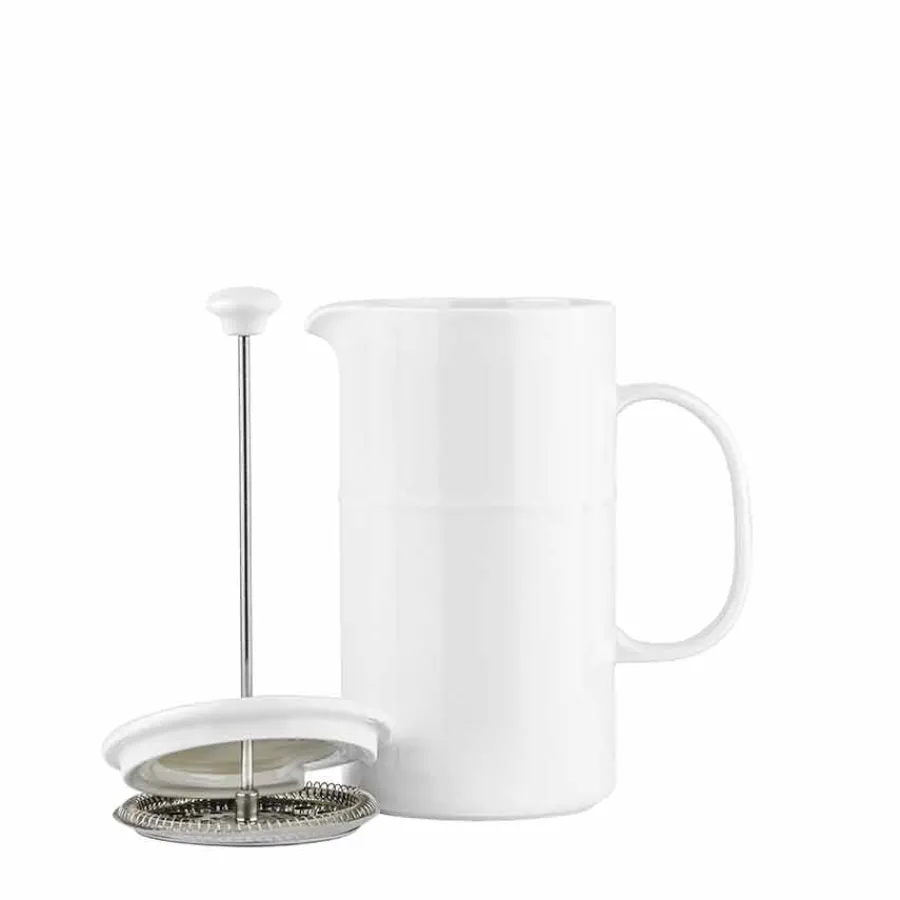 Denne ildfaste presskannen i hvitt porselen er det perfekte valget for deg som ønsker en kombinasjon av funksjonalitet og stil. Med en kapasitet på 1 liter kan den brygge opptil 7 kopper aromatisk kaffe, ideell for lange frokoster eller hyggelige kaffestunder med venner og familie.Det robuste porselenet holder bedre på varmen enn tradisjonelle glasskanner, slik at kaffen forblir varm lenger. Den glaserte overflaten gir ikke bare en elegant finish, men gjør også kannen enkel å rengjøre og motstandsdyktig mot riper. Designet er både tidløst og moderne, slik at den passer inn i ethvert kjøkken.Tåler oppvaskmaskin og er en del av den bærekraftige Ildfast-serien, som kombinerer holdbarhet med estetikk. Kombiner med ildfaste serveringsfat for en stilren og helhetlig borddekking.