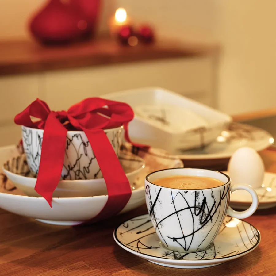 Espressokopp på 6 cl fra Porsgrunds Porselænsfabrik og serviset Partitur, designet av kunstneren Ole Lislerud. Den detaljrike serien Partitur ble først lansert i 1999, med motiver inspirert av detaljer fra Arne Nordheims partitur til balletten «Stormen». Espressokoppen legger til et estetisk element på frokost- eller middagsbordet, og er ideell for å nyte en deilig varm espresso på morgenkvisten eller ved siden av desserten til middagsselskapene.