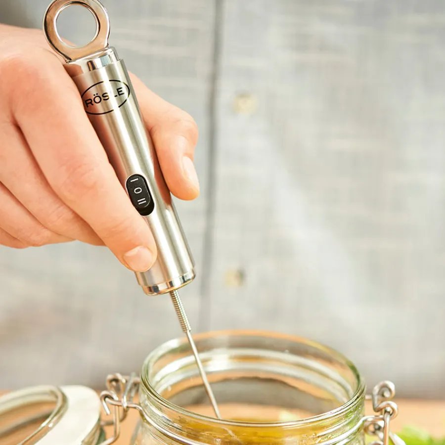 Melkeskummer i 23 cm fra Rösle fremstilt i 18/10 rustfritt stål. Den praktiske melkeskummeren er utmerkende til å lage melkeskum til kafeen, og kan i tillegg brukes til å blande melk, shakes og vinaigrette-dressinger. Skummeren kommer med en innstilling på to hastigheter og batteri medfølges.