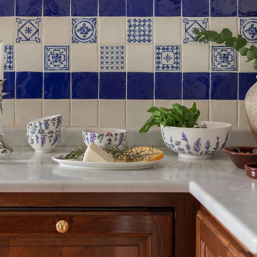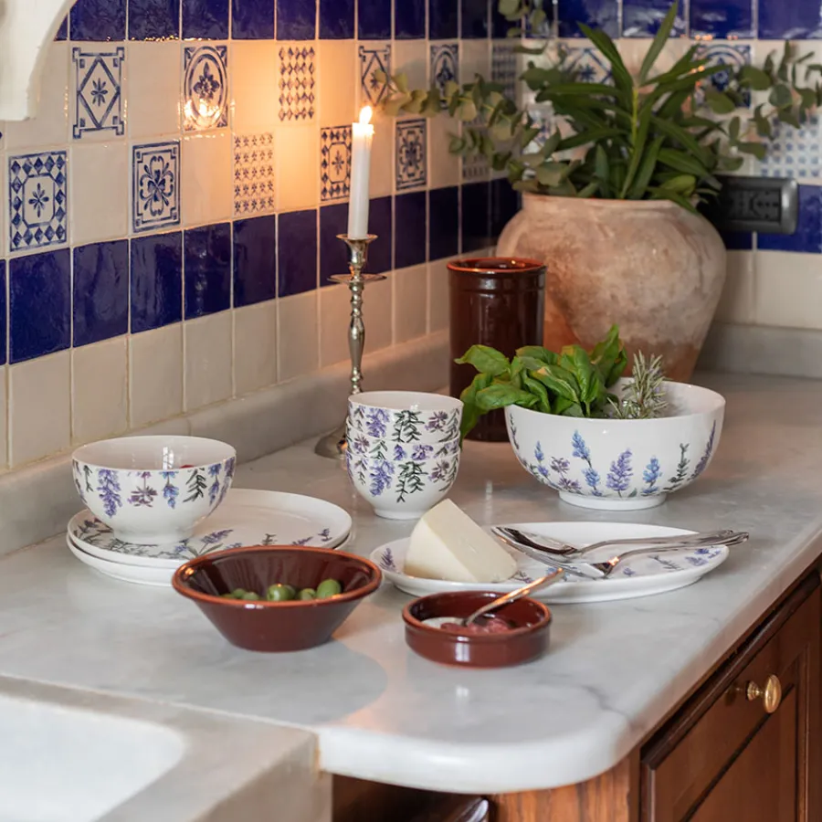 Bolle på 11,5 cm fra serviset Provence og Christiania 1739. Dekoren på serviset er hentet fra velduftende lavendelenger fra nettopp Provence, som skaper en nydelig ramme rundt måltidet. Kombinasjonen av det hvite porselenet og blomstenes delikate fargetoner gjør serviset velegnet i de ulike sammensetninger, store og små.