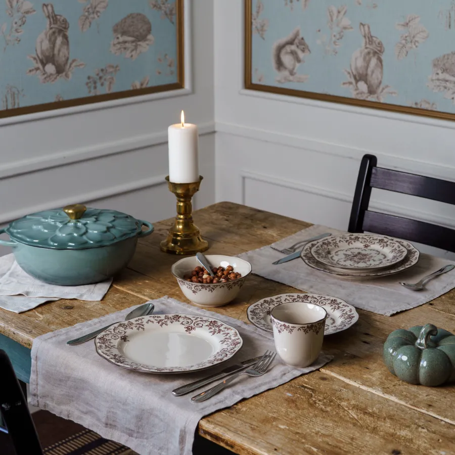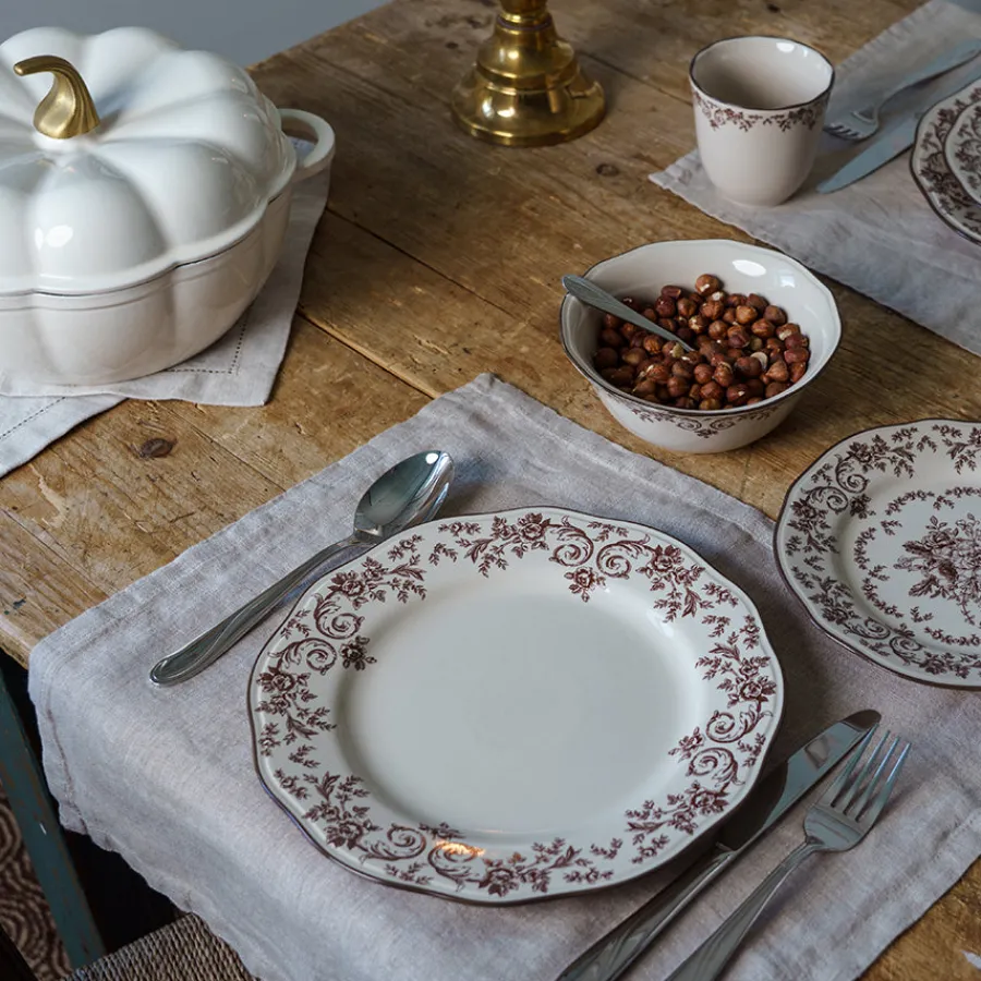 En stor middagstallerken med burgunder blomsterprint som tilfører varme og eleganse til borddekkingen. Fall Collection gir en følelse av klassisk eleganse med sitt detaljrike vintage-design.Burgunderfargen gir serviset et sofistikert preg, og den robuste kvaliteten gjør det til et praktisk valg for daglig bruk. Laget i slitesterkt steingods og tåler oppvaskmaskin.