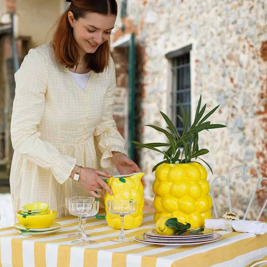 La hjemmet ditt få et friskt og livlig preg med denne sjarmerende sitronvasen fra Capri Collection. Med en høyde på 23,5 cm er den perfekt for både friske blomster, tørkede buketter eller som en dekorativ skulptur på spisebordet eller kjøkkenbenken. Det detaljerte sitronmønsteret gir en autentisk middelhavsfølelse og passer like godt i moderne som rustikke hjem.Vasen er laget av keramikk med en glanset finish, noe som gir en luksuriøs følelse. Den solide konstruksjonen sørger for stabilitet, og den brede åpningen gjør det enkelt å arrangere blomster på en vakker måte. Denne vasen er mer enn bare en blomsterpotte – den er et kunstverk i seg selv. Plasser den på en kommode, spisebord eller kjøkkenbenk og nyt dens friske og inspirerende uttrykk.
