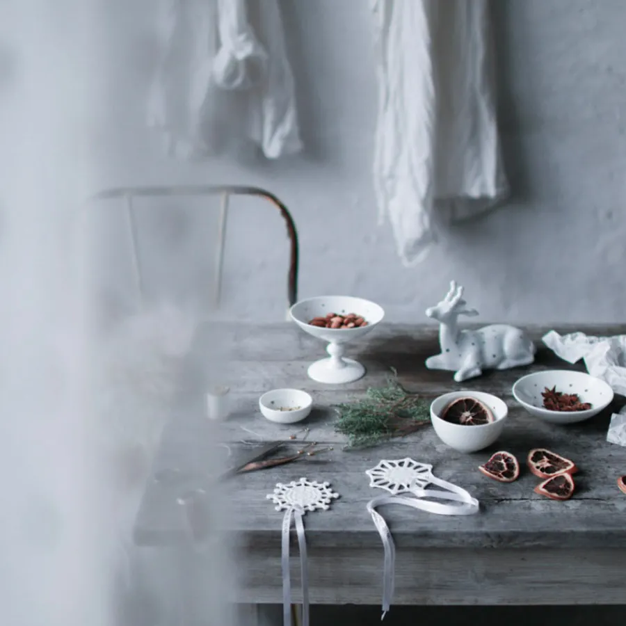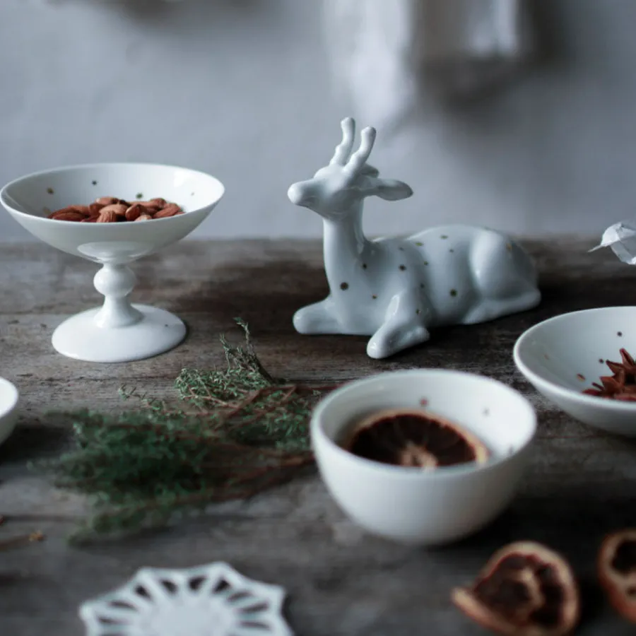 Skål på stett fra Wik & Walsøes eventyrlige servise Stjernedryss. Inspirert av det enkle og rene en stille og klar vinternatt formilder har den flotte serien fått vakre stjernedetaljer i 24 karat gull på hvitt benporselen. Skålens enkle former gjør den flott til ethvert hjem, til servering av konfekt eller det minste middagstilbehør. Skålen måler 12 cm.