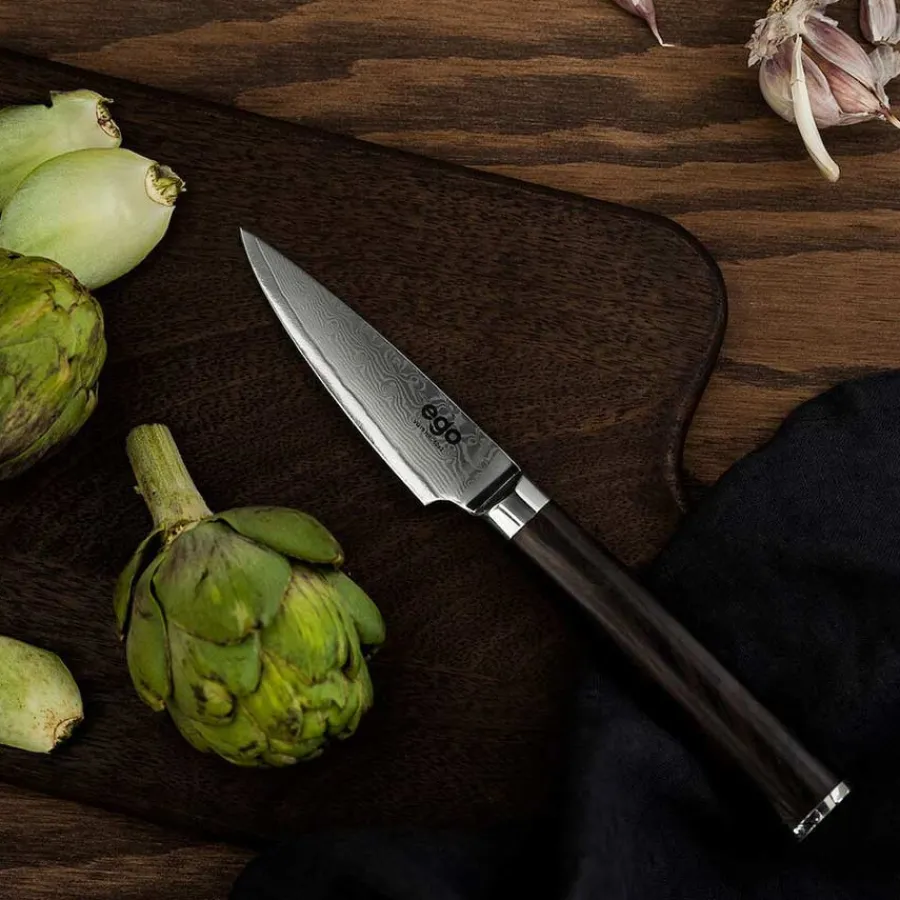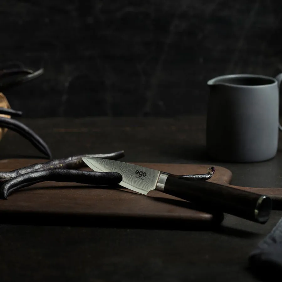Grønnsakskniv i sylskarpt rustfritt stål fra Wilfas serie Ego med kniver anbefalt av det Danske Kokkelandslaget. Knivbladet har kjerne av VG-10 stål, med overflate av 67 lag damask stål som gjør kniven ekstremt skarp og holdbar. Skaftet på kniven er laget i behandlet pakkatre som ligger godt i hånden. Kniven må vaskes for hånd og tørkes raskt etter bruk.