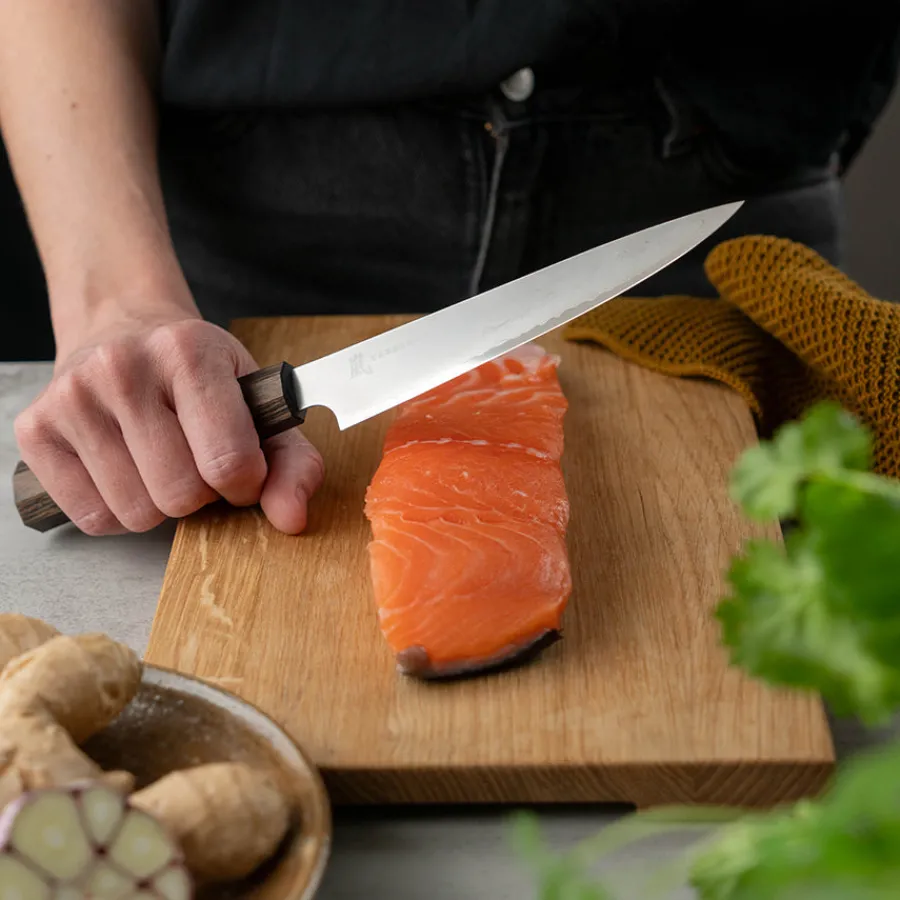 Det ergonomiske håndtaket i mørk pakkawood gir både slitestyrke og en behagelig følelse, mens det kantete designet forsterker det tradisjonelle japanske uttrykket serien Hana er kjent for.