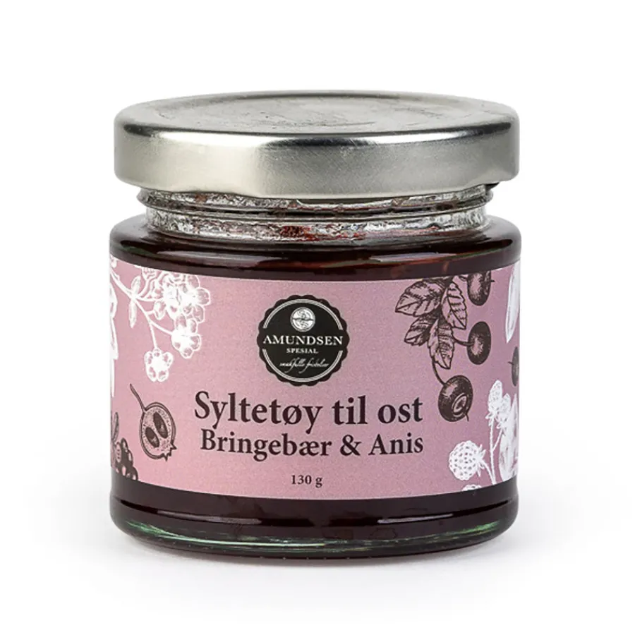 Syltetøy med bringebær og anis på 130 gram fra Amundsen. Syltetøyets smakskombinasjoner gjør det utsøkt til ostebordet, og passer spesielt utmerket til fløyelsmyk brie.