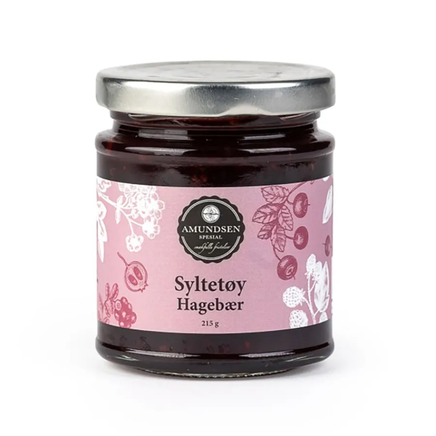 Syltetøy fra Amundsen laget av typiske hagebær, som gir en nydelig kombinasjon av jordbær, morello kirsebær, rips og bringebær. Syltetøyet er laget på tradisjonelle oppskrifter og inneholder 215 gram.