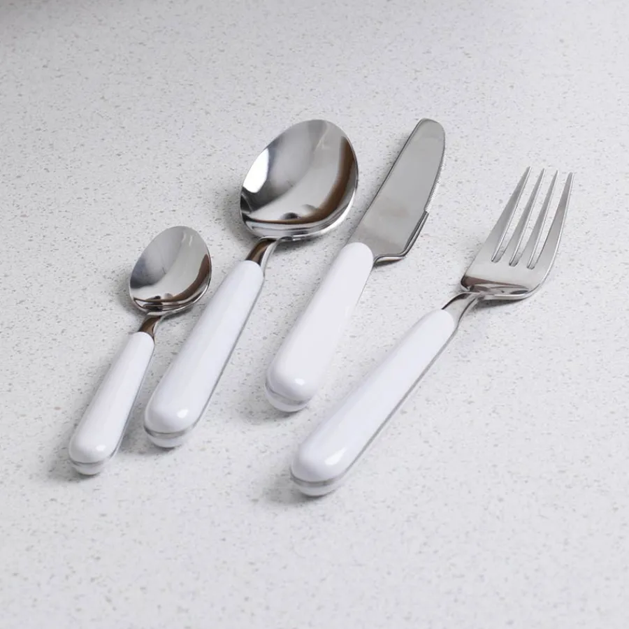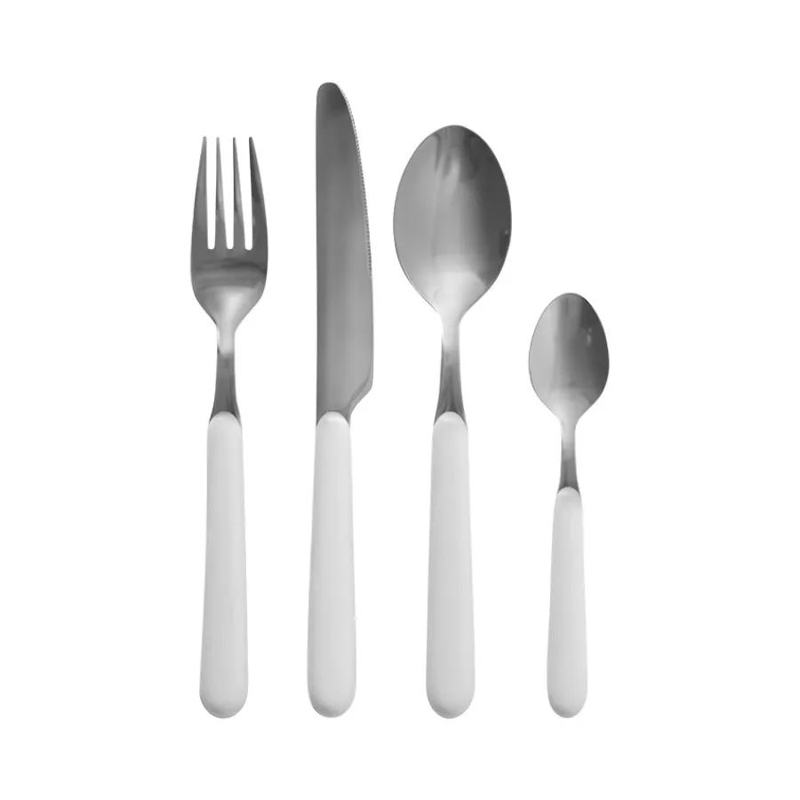 Bari Bestikksett i 16 deler fra Christiania 1739. Dette elegante bestikksettet med 16 deler er laget av rustfritt stål og har hvite BPA-frie plasthåndtak. Det enkle og tidløse designet passer perfekt til ethvert bord og enhver anledning og de hvite håndtakene gir et moderne og elegant preg. Bestikksettet kan vaskes i oppvaskmaskin.
