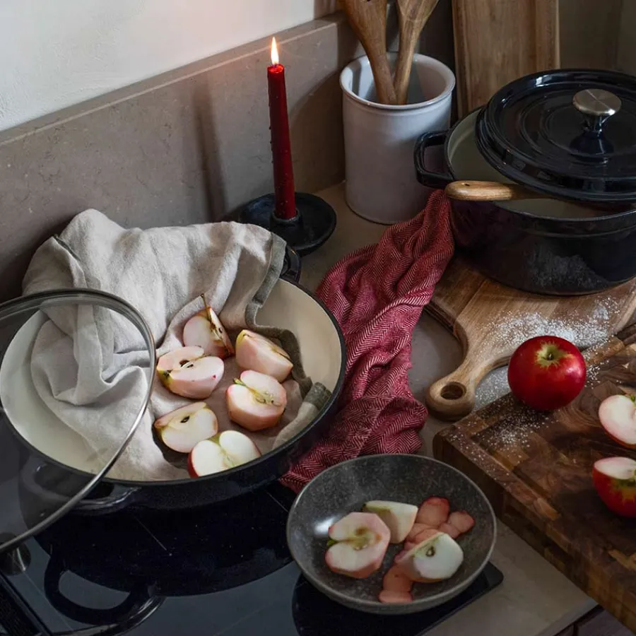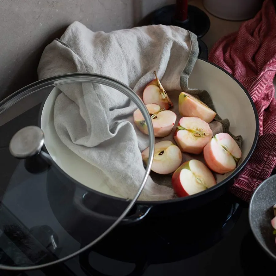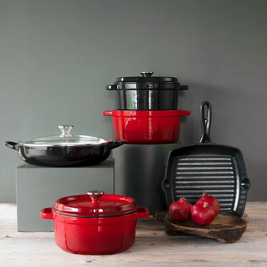Lav støpejernsgryte i svart fra Christiania 1739. Gryten er utstyrt med glasslokk som lar deg ha større kontroll på maten mens den står på kokeplaten, og er fremstilt i emaljert støpejern som sikrer en svært god og jevn varmefordeling. Materialet holder godt på varmen, selv etter koketoppen er slått av. Håndvask av støpejernsgryten anbefales. Bruk ikke metallbørste eller skurebørste da dette kan skade emaljen.