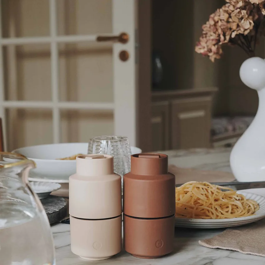 Sett smak og stil i system med Billund krydderkvern fra CrushGrind® i den varme og naturlige fargen Cinnamon. Det smarte upside-down-designet holder bordet fritt for krydderrester, samtidig som den kompakte formen gjør kvernen enkel å håndtere.Laget i lett, slitesterkt biokomposittmateriale og utstyrt med en praktisk silikonplugg i bunnen, er kvernen både funksjonell og miljøvennlig. Den keramiske CrushGrind®-mekanismen gir justerbar kverning og presis kontroll – perfekt for salt, pepper og tørre krydder.Billund i Cinnamon kombinerer naturlige toner med moderne funksjonalitet – en liten kvern som gjør en stor forskjell på kjøkkenet eller spisebordet.