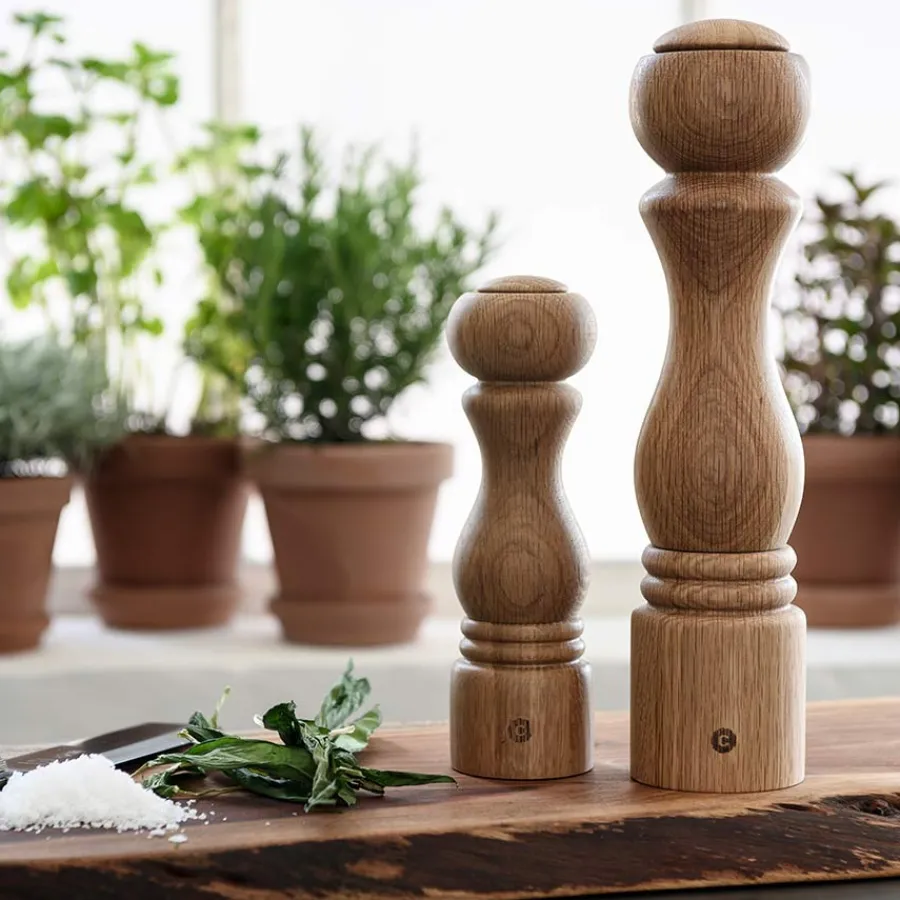 Krydderkvern i eik fra Crushgrind og serien Torino. Kombinasjonen av form og eik med en oljefinish gjør kvernen like flott til kverning av krydder som stående fremme på kjøkkenbenken som et dekorelement. Kvernen måler 30 cm og kommer med Crushgrind sin patenterte mekanisme. Krydder fylles enkelt ved å trekke opp proppen på toppen av kvernen. Kan brukes til salt eller pepper.