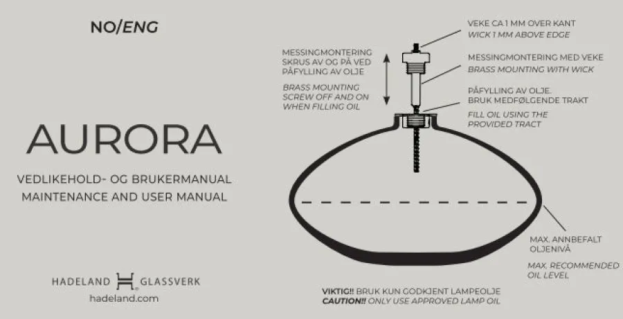 Fyll aldri oljen til mer enn anbefalt mål som vises i bruksanvisningen medfulgt. Veken skal ikke stikke opp mer enn 1 mm over kanten. Bruk kun godkjent lampeolje. La aldri produktet stå uten tilsyn når den er tenkt. Olje kjøpes separat.