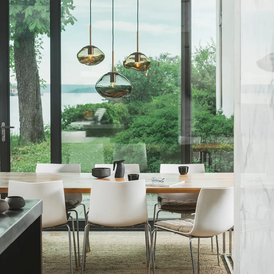 Designet av Hadeland Glassverks team ved Maud Gjeruldsen Bugge, leveres pendelsettet med en sort, rund baldakin på 340 mm med tre hull, som gir et rent og balansert uttrykk. Flint passer perfekt over et lite spisebord, i et hjørne eller som et varmt blikkfang i entré eller stue.