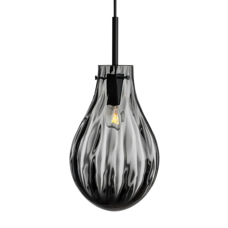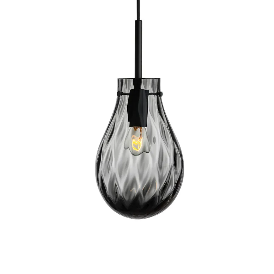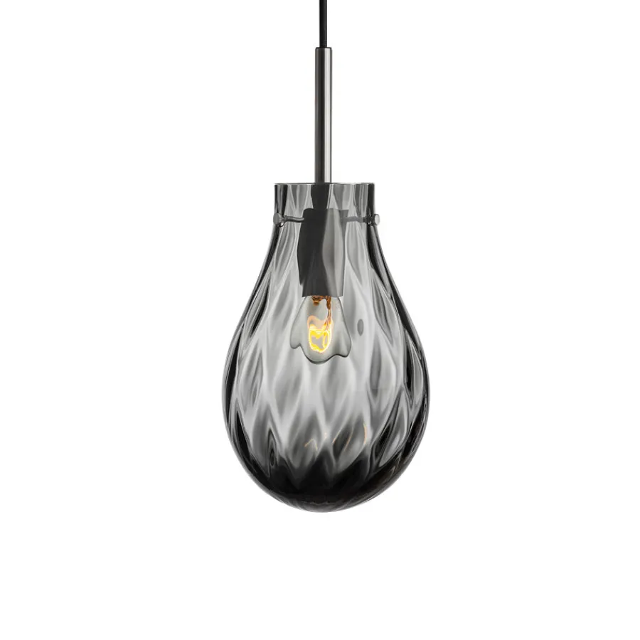 Pendellampen Dråpe er inspirert av vannets bevegelser og refleksjoner. Den munnblåste glasskuppelen i elegant røkgrå kombinerer to ulike mønstre i glasset, som skaper et unikt spill av lys og skygger mot veggen. Den subtile fargetonen gir lampen et sofistikert preg, mens dobbeltoptikken tilfører liv og dybde. Lampen fungerer like godt som et enkeltstående blikkfang som i en klynge, og passer perfekt over spisebordet, i stuen eller i en trappeoppgang.