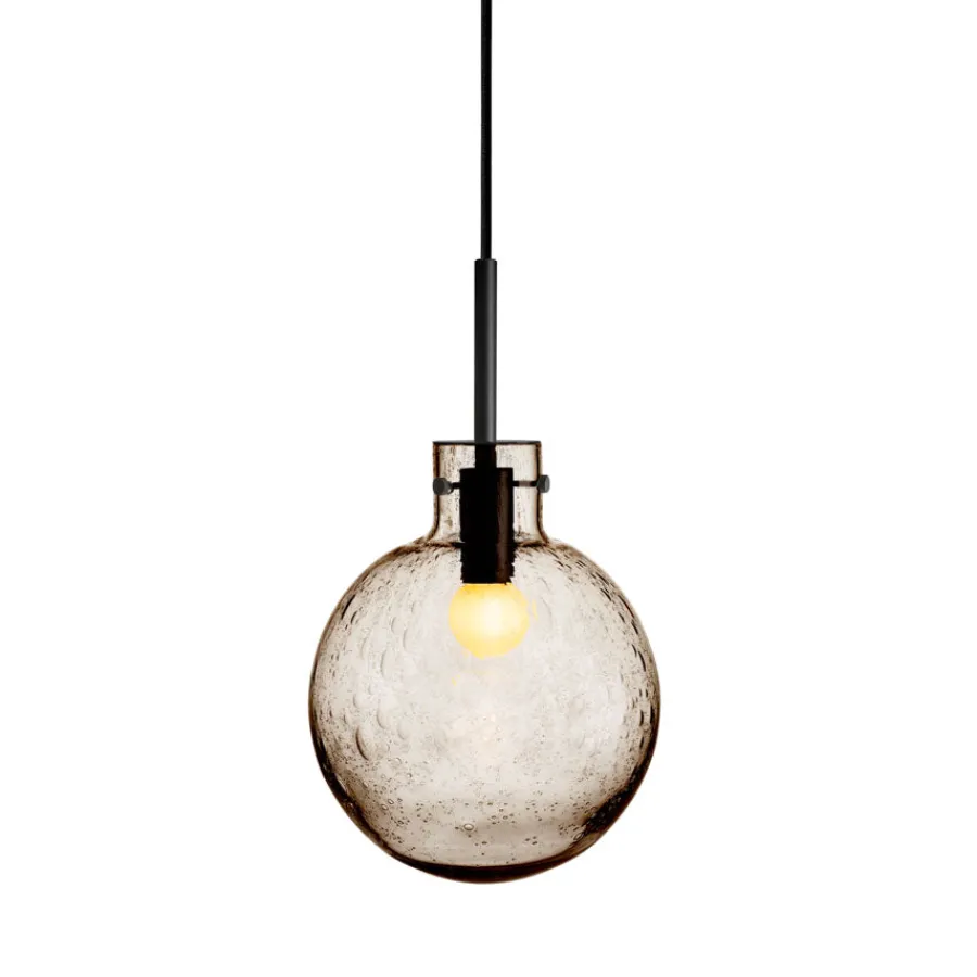 Krystallkule Taklampen i Soda Kakao kombinerer varmt farget glass med det unike boblemønsteret som kjennetegner Soda-teknikken. Teknikken skaper små luftbobler i glassmassen, som gjør hver lampe helt spesiell.