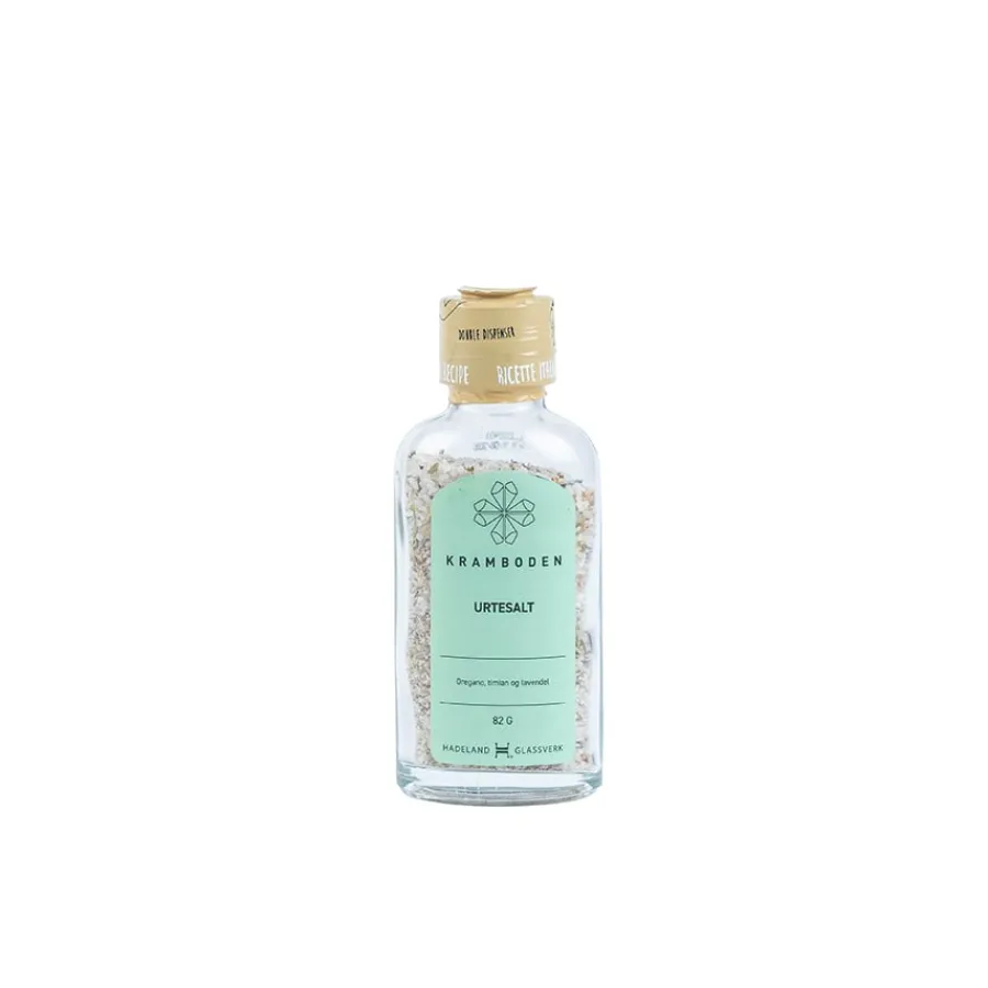 Salt med urter fra Kramboden. Saltblandingen inneholder oregano, timian og lavendel, som sammen med saltet skaper en god smak i maten. Flasken inneholder 82 gram.