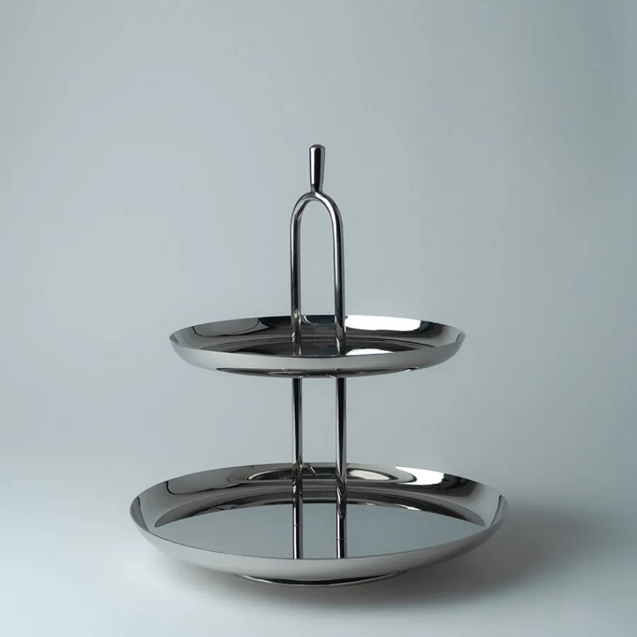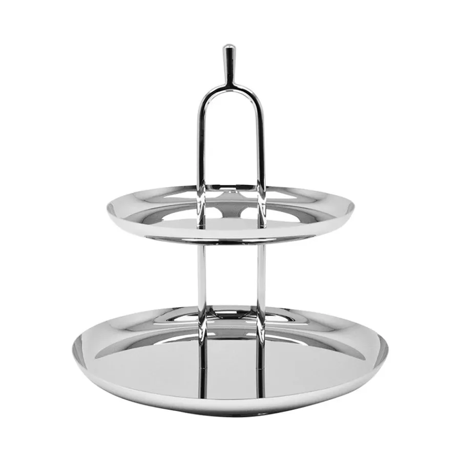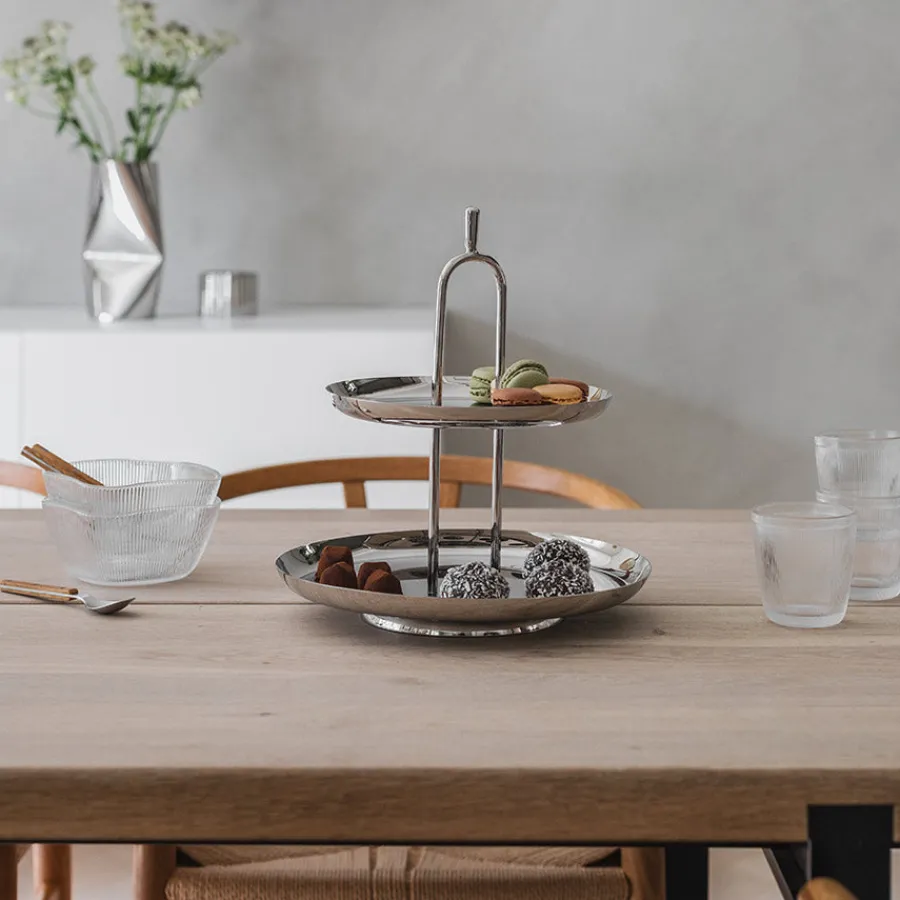 Dette elegante kakefatet i to etasjer fra Løve Vinje er en fest i seg selv. Med total høyde på 30 cm gir det flott presentasjon av kaker, cupcakes, småretter eller frukt. Den sølvfargede overflaten gir et luksuriøst preg til bordet.