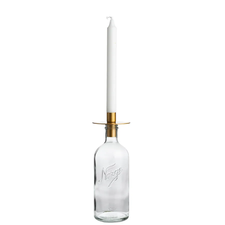 Lysholder til Norgesflaske i gullfarge. Lysholderen har en bred flate som hindrer stearin fra å dryppe ned på bordet. Sett kronelys i lysholderen og få en helt unik lysestake som du kan dekorere med for eksempel granbar til jul.