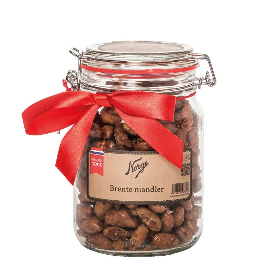 Brente mandler i en tradisjonell og deilig smak fra Norgesglasset. Denne klassiske julefavoritten blir presentert i et nostalgisk Norgesglass som kan gjenbrukes etter mandlene er spist opp, og dekoreres med en vakker sløyfe. En perfekt gave til noen som fortjener en liten oppmerksomhet.