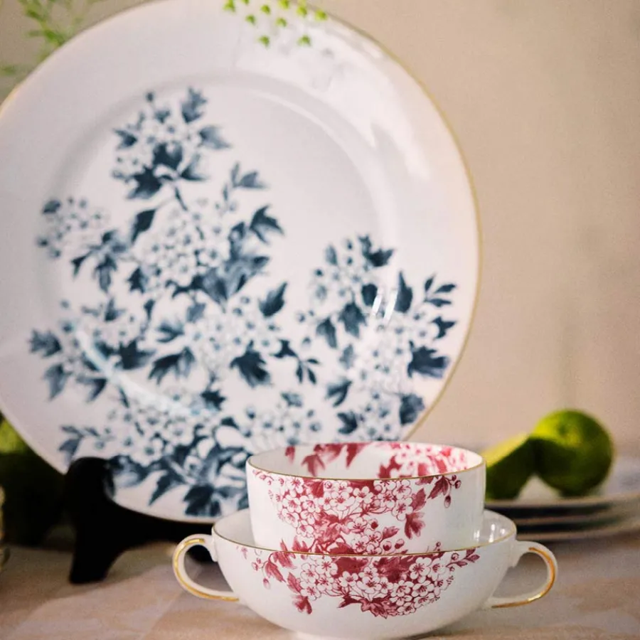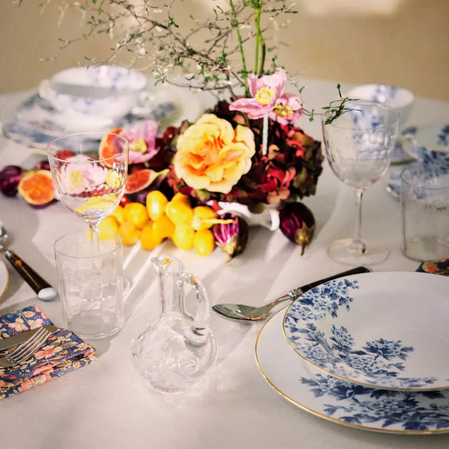 Designet av ByTimo, denne store middagstallerkenen er dekorert med vakre blå blomster og elegante gulldetaljer. Tallerkenen er inspirert av vintage engelsk porselen og gir bordet et sofistikert preg. Laget i benporselen, er den slitesterk og perfekt for både festlige måltider og hverdagsbruk.