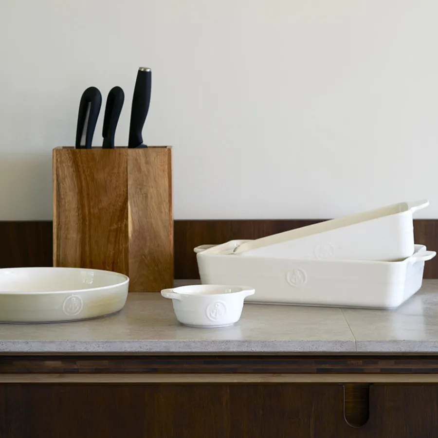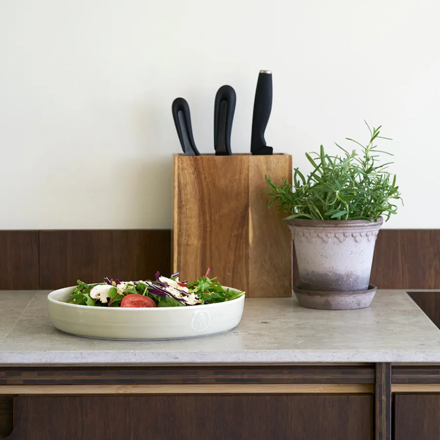 Knivblokk i akasietre fra Porsgrunds Porselænsfabrik og serien De Cuisson. Knivblokken er utformet med stråinnlegg som gjør at knivene står stødig og kan plasseres i flere ulike posisjoner, og sammen med det stilfulle, enkle designet gjør den seg flott på kjøkkenbenken. Stråinnlegget kan tas ut, og knivblokken vaskes enkelt med en fuktig klut.