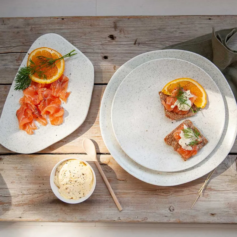 Asjett fra serviset Natur fra Porsgrunds Porselænsfabrik. Asjetten har en organisk form inspirert av den nordiske naturens kontraster, fra den myke skogen til det harde fjellet. Asjetten måler 24 cm og er perfekt til servering av tapas, sideretter eller mindre måltider som frokost og lunsj. Asjetten kan vaskes i oppvaskmaskin.