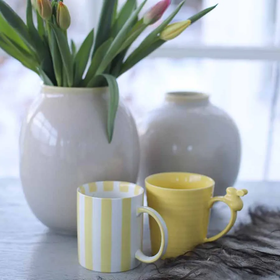 Lys opp påskefrokosten med disse sjarmerende koppene fra Porsgrund Porselænsfabrik. Settet består av to kopper med unikt påskedesign – én med friske gule striper og én med en søt hare sittende på hanken. Perfekt for varme drikker gjennom hele påskehøytiden! Disse koppene bringer varme og glede til påskebordet og passer like godt til kaffe, te eller kakao. En flott gaveidé eller en stemningsfull detalj til din egen påskefeiring!