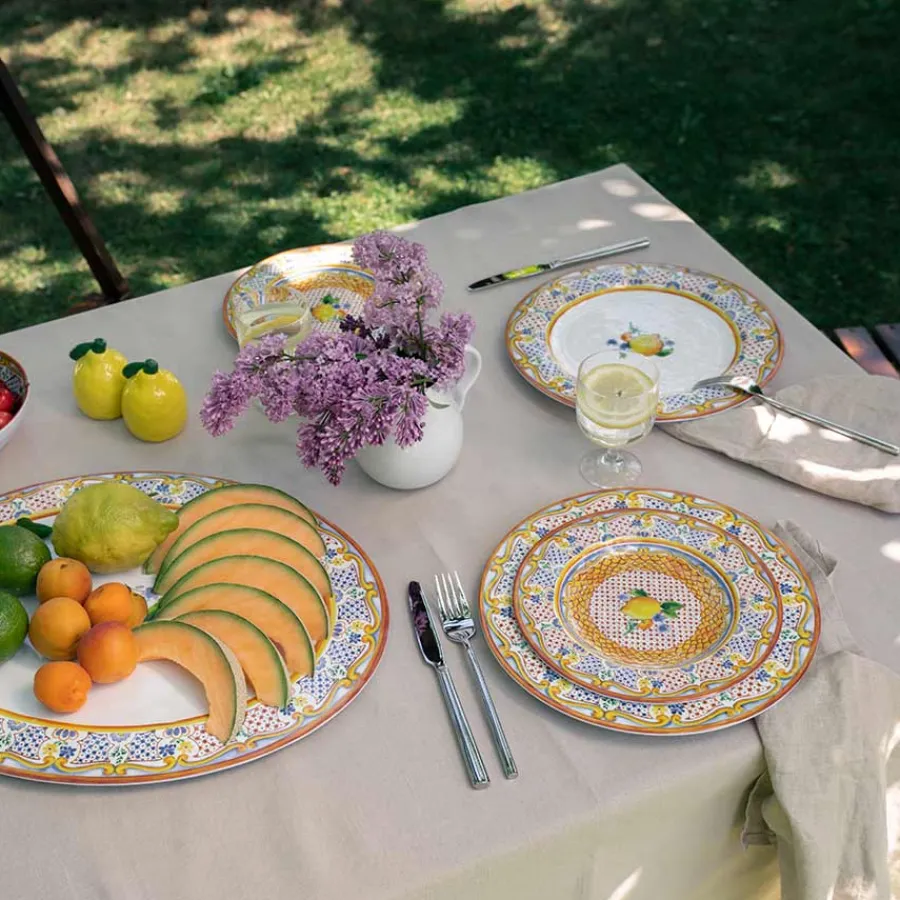Tallerken i melamin fra Christiania 1739 og serien Capri. Den detaljrike serien prydes av flotte mønstre og farger inspirert av den vakre øyen Capri, som ligger utenfor sørkysten i Italia. Det øyenfallende designet gjør seg flott dekket på til sommerbordet, og materialet gjør tallerkenen spesielt utmerket til utendørsbruk.