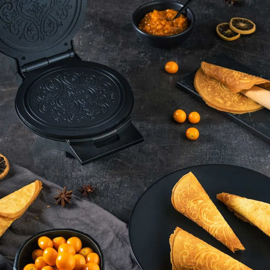 Culture krumkakejern i sort fra Wilfa. Krumkakejernet er utformet med det tradisjonsrike østerdalsmønsteret og kommer med en effekt på 1000 watt. Utstyrt med en nøyaktig termostat som du selv kan stille inn etter ønsket resultat, og belagt med dobbelt slippbelegg som gjør at krumkaken slipper lett fra jernet, og samtidig sikrer en effektiv rengjøring. Kan oppbevares stående.
